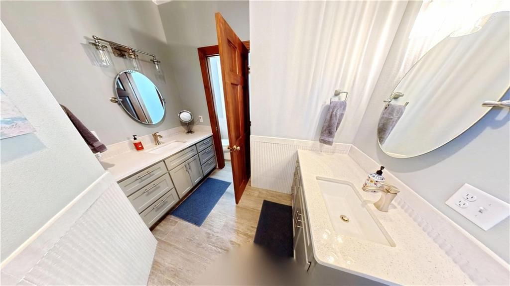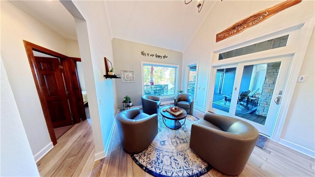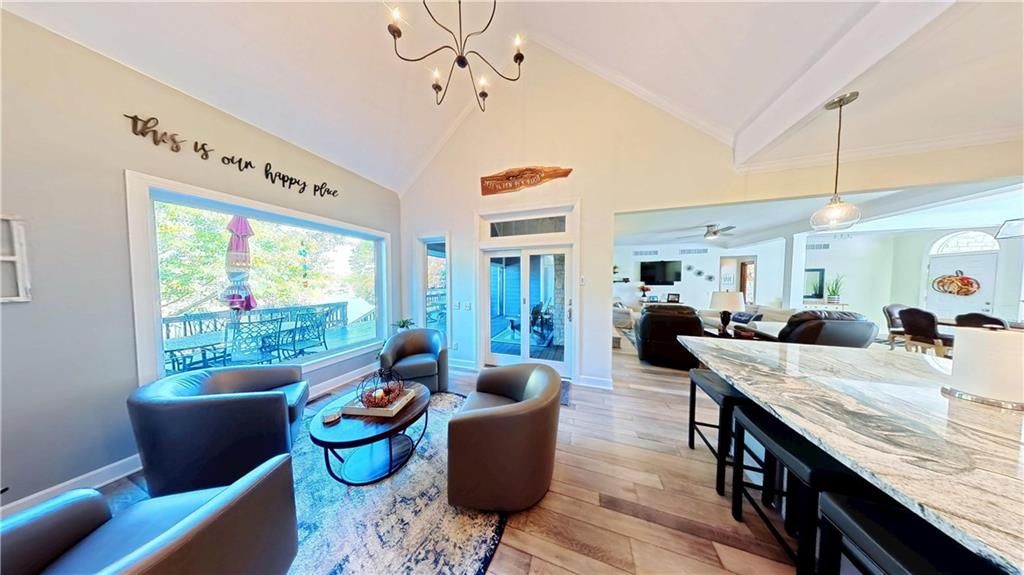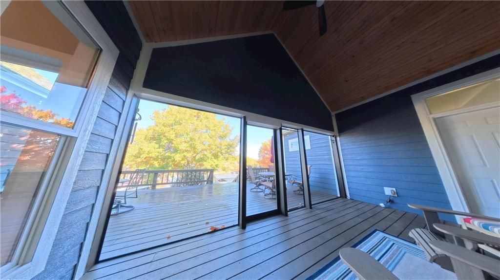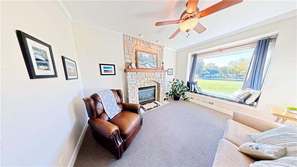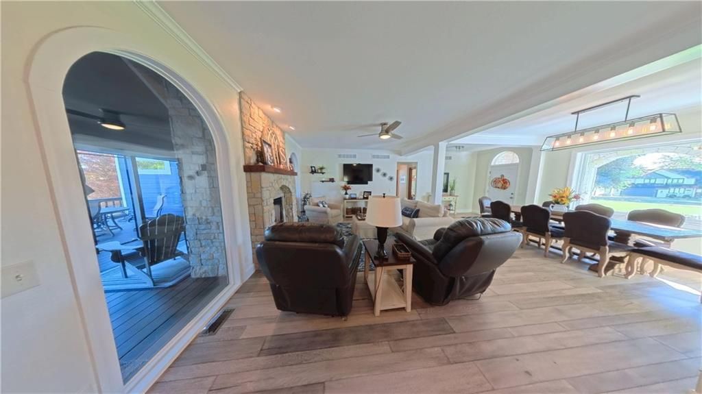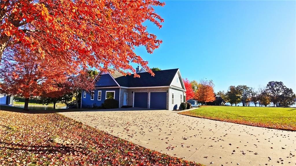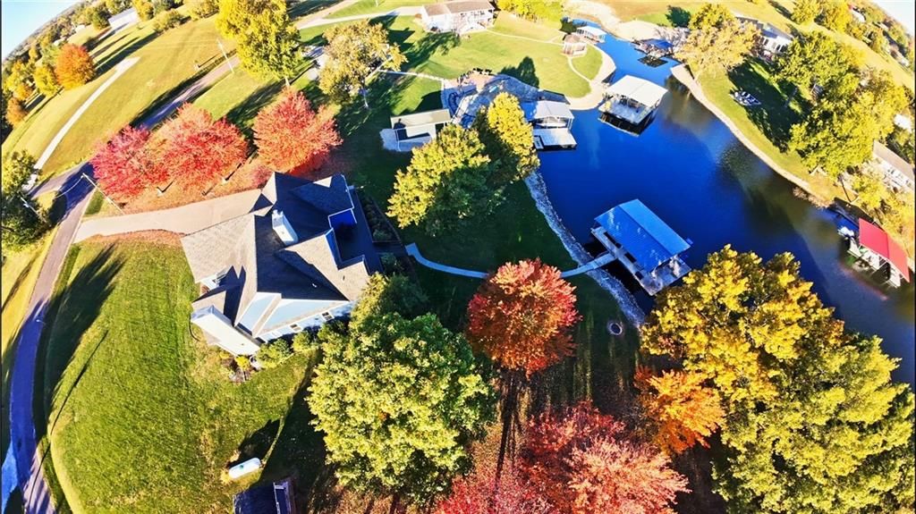 This stunning lakefront home offers true level living with a spacious open-concept design. Upon entering, you're greeted by a beautiful living room featuring a stone fireplace and large arched windows that overlook the screened-in porch - perfect for taking in the serene lake views. The open kitchen is a chef's delight, featuring gray cabinetry, stainless steel appliances, a gas range with a granite surround, and a touch-sensor faucet. A charming breakfast nook provides the perfect spot for morning coffee, while the large dining area is ideal for gatherings. Just off the kitchen, you'll find a convenient laundry room and a tucked-away pantry. The den offers a cozy retreat with a bay window seat and a second stone fireplace. The main level also includes two guest bedrooms connected by a Jack and Jill bath, plus a full guest bathroom. The primary suite is a true retreat, showcasing a detailed ceiling and private access to the screened-in porch. The ensuite bath features beautiful wainscoting tile, a walk-in tiled shower, and stylish finishes. The lower level is perfect for entertaining, complete with a spacious rec area, a dedicated pool table room, and two additional rooms for your personal use - ideal for a home gym, hobby space, or office. A wood-burning fireplace and full bath complete the lower level. Step outside to enjoy a large deck and your two-bay covered concrete dock with a pontoon lift, jet ski lift, and generous seating area - complete with wet steps and a high jump ladder for fun at the lake! A small storage shed 10x12 and two-car attached garage add extra convenience. Come experience what true level lake living is all about! Make your appointment today - call Nadine at 816-390-7938.Ckick on Video for more details.