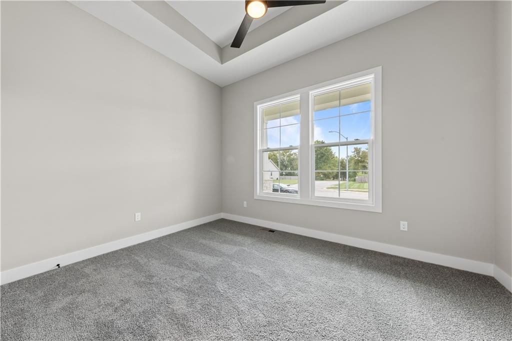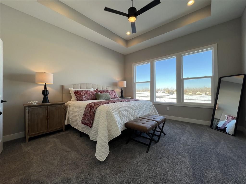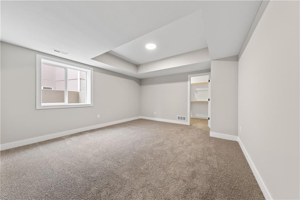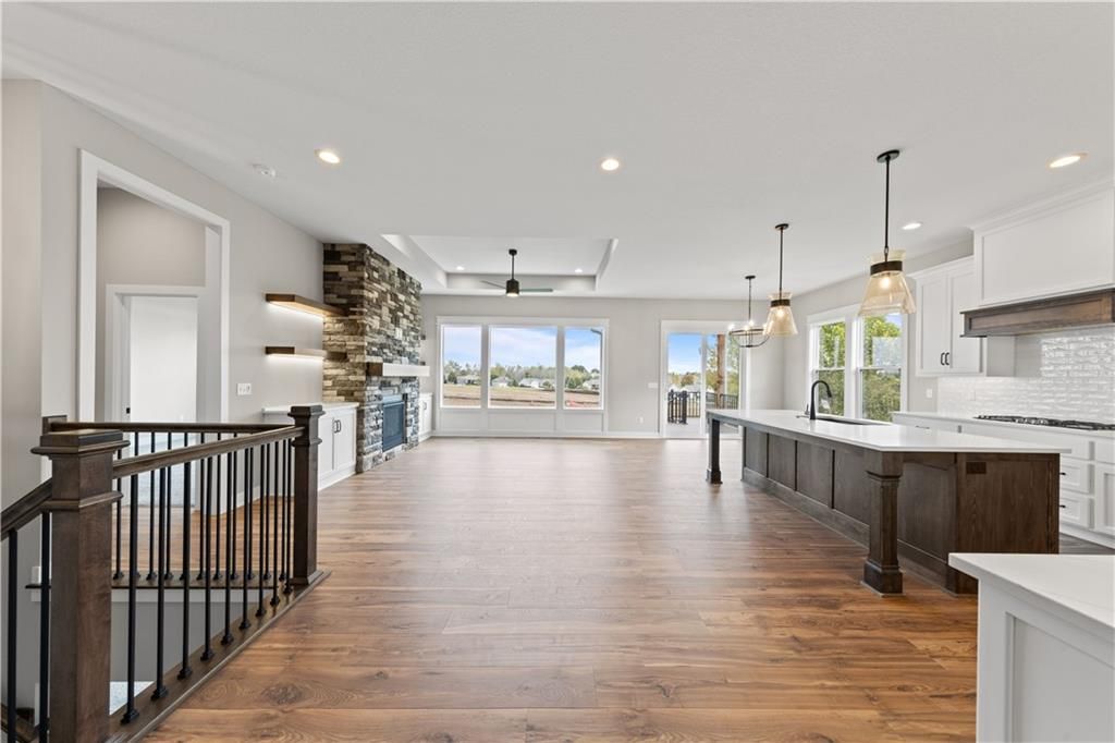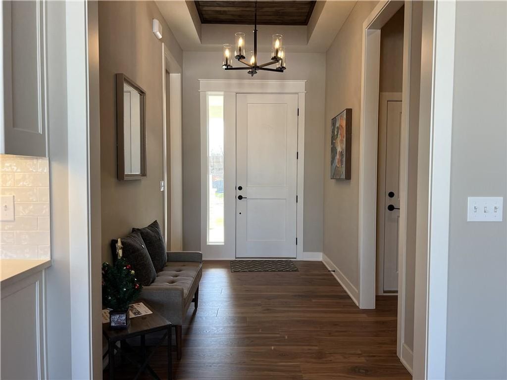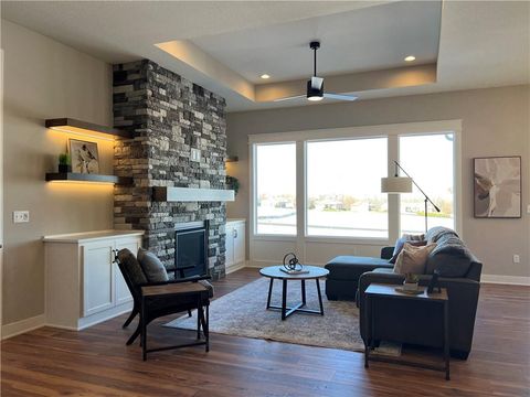 This Inspired Homes Fairfield Reverse 1.5 Story on a WALKOUT lot is the total package - inside and out! From the moment you step into the grand, light-filled foyer, you'll feel the elevated design and thoughtful layout unfold before you. Soaring 10' ceilings, oversized custom windows, and high-end upgrades set the stage for style and sophistication. The stunning great room is a showstopper - featuring a coffered ceiling with rich wood accents and a statement stacked-stone fireplace that anchors the space perfectly. The open-concept kitchen is a chef's dream: custom cabinetry, a massive island, GE stainless built-ins including a gas cooktop, and an extra-large walk-in pantry to keep everything organized and out of sight. The main-floor primary suite is a true retreat with tray ceiling, spa-style bath, dual vanities with custom tower storage, and a huge walk-in shower. Bonus? The laundry is cleverly tucked off the primary closet - making daily life easier than ever. The second main-level bedroom offers ideal flexibility as a guest suite or home office. Downstairs, the finished lower level impresses with 9-foot ceilings, a spacious rec room with a sleek wet bar - perfect for game days, movie nights, or entertaining - plus two more generous bedrooms and a full bath. Step outside to enjoy your covered deck AND patio - the perfect setting for morning coffee or sunset drinks. All of this is nestled in Kensington Farms, where residents enjoy access to a sparkling community pool, playground, walking trails, and easy access to Downtown Lee's Summit, Summit Fair, top schools, shopping, dining, and more.