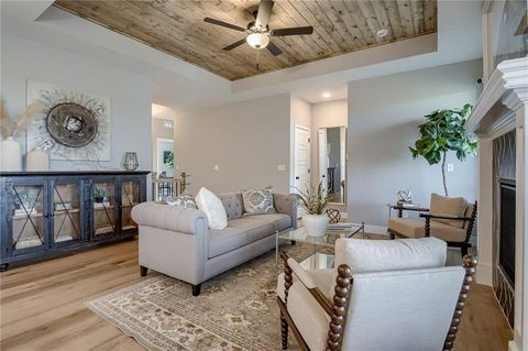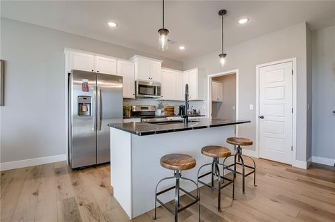 The Kinley by Ashlar Homes - where modern farmhouse charm meets thoughtful design. This stunning one-level home offers exceptional curb appeal with its stylish exterior and spacious 3-car garage. Inside, you'll find 3 bedrooms and 2 full baths, and beautiful finishes. The open-concept layout showcases quartz countertops, a tile backsplash, and LVP flooring that flows seamlessly through the entry, living room, kitchen, and dining areas. Elegant accent ceilings enhance the entry and living spaces, adding architectural flair. Retreat to the primary suite featuring a bath with tile shower walls and tile flooring. Enjoy evenings outside watching the sunset on the covered patio. Located in a highly desirable community, residents enjoy exceptional amenities including a swimming pool, playground, fishing pond, and firepit. Coming soon are even more features, including pickleball and basketball courts, a 3-hole frisbee golf course, and a grass-seated amphitheater perfect for gatherings and community events. Estimated completion of this home is April 2026. Photos and video are from another Kinley model home. Finishes will be different.
