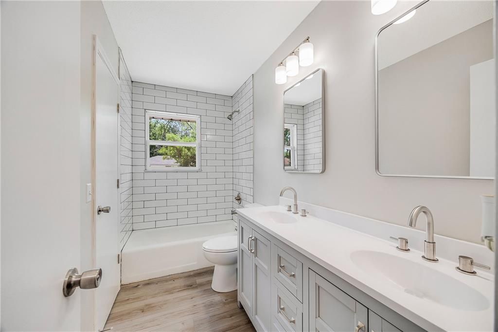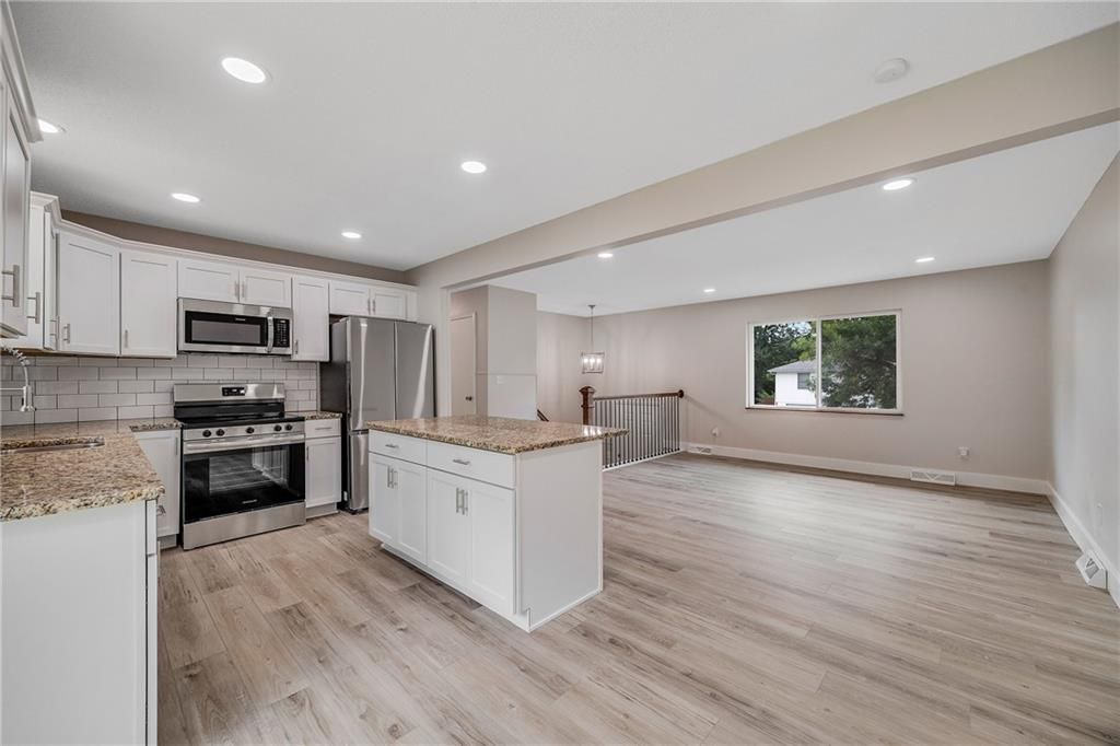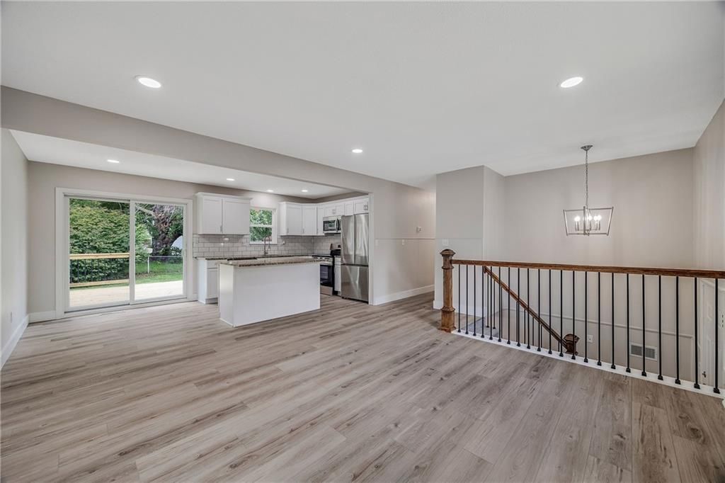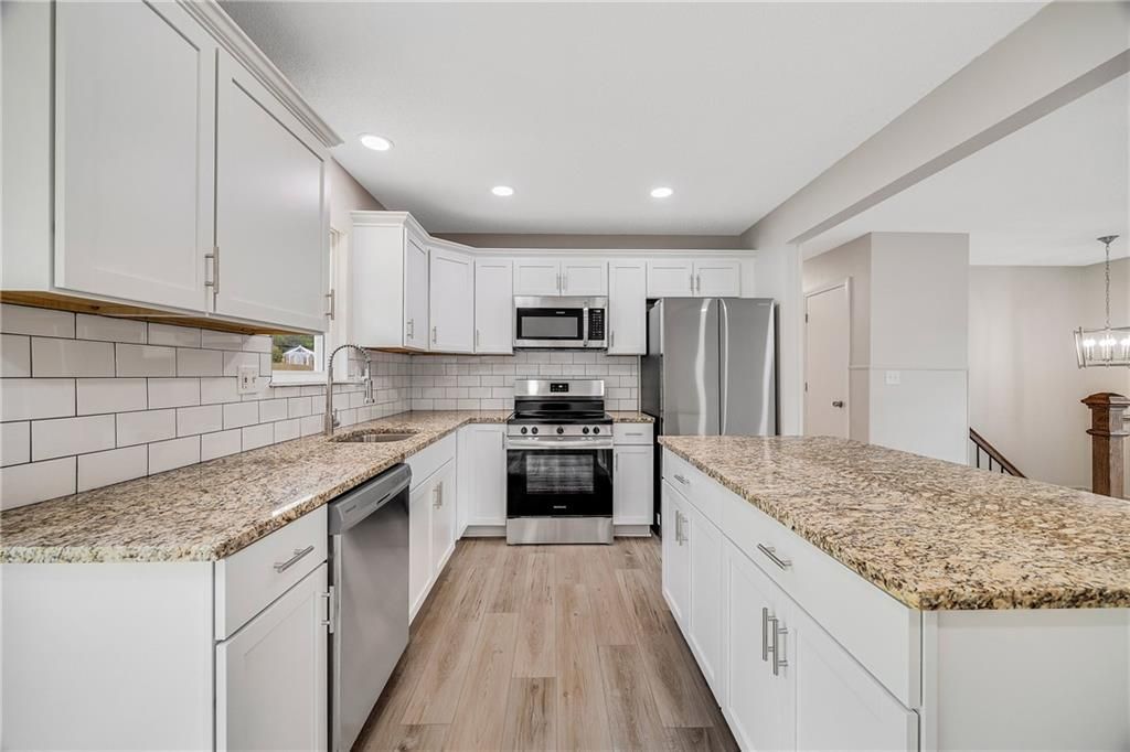 Welcome to this beautifully renovated 4-bedroom, 2-bath split entry in a great location! Step inside to find an open, light-filled living area with fresh paint, modern lighting, and brand-new luxury vinyl plank flooring throughout. The stunning kitchen features crisp white cabinetry, granite countertops, subway tile backsplash, a center island, and stainless steel appliances - perfect for everyday living or entertaining. Three spacious bedrooms on the main level share a stylishly updated full bath with a double vanity and tiled shower surround. The finished lower level offers a versatile second living space, full bath, and laundry, along with access to the oversized two-car garage. Enjoy the outdoors on the brand-new back deck overlooking the fenced yard - ideal for pets, play, or gatherings. With a new HVAC, new roof, new windows, new deck, updated finishes, and move-in ready condition, this home combines style, comfort, and functionality.