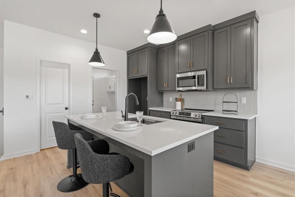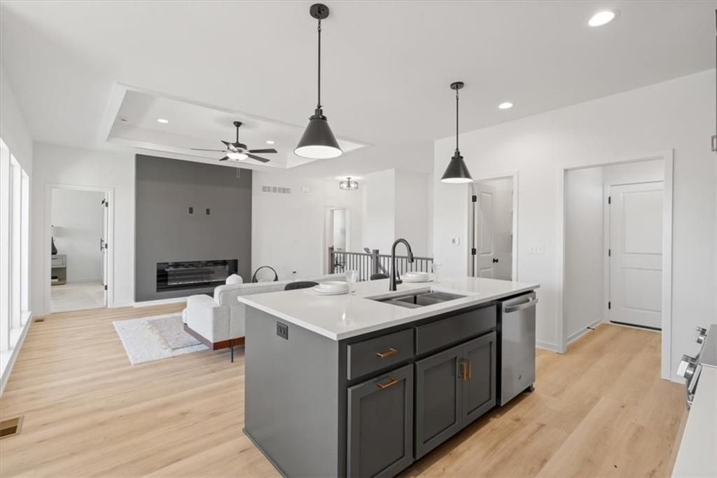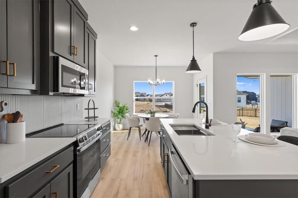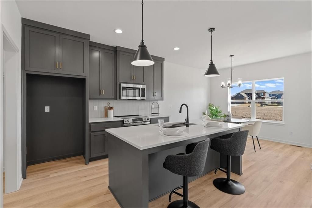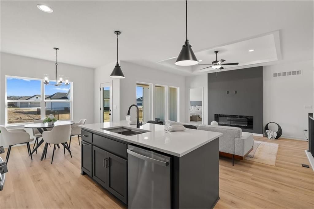 The Greystone by Elevate Design + Build is a 4-bedroom, 3-bathroom home on a day-light lot showcasing a sleek modern design with an open layout flooded with natural light. The home includes a unique linear fireplace and a covered back deck. The spacious finished lower level is perfect for entertaining or relaxing. This builder highlights the craftsmanship and attention to detail that elevate new construction in Lees Summit. Photo is a sample of the same front elevation of home. Actual color and material choices may vary.