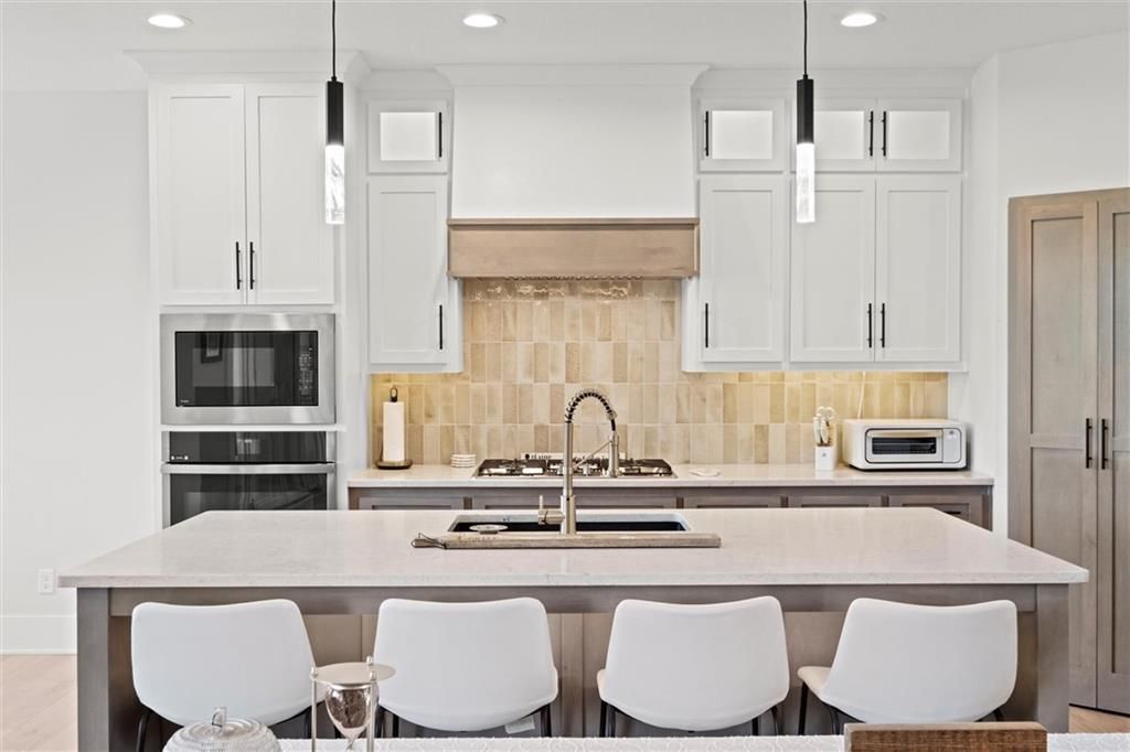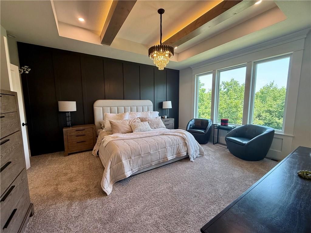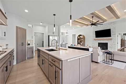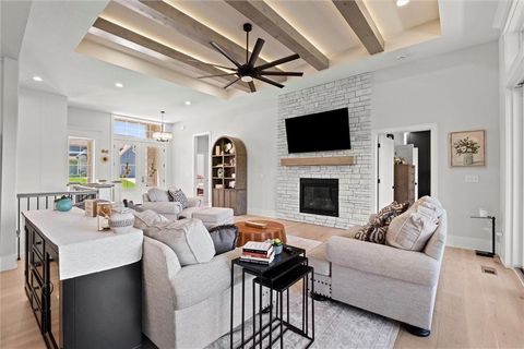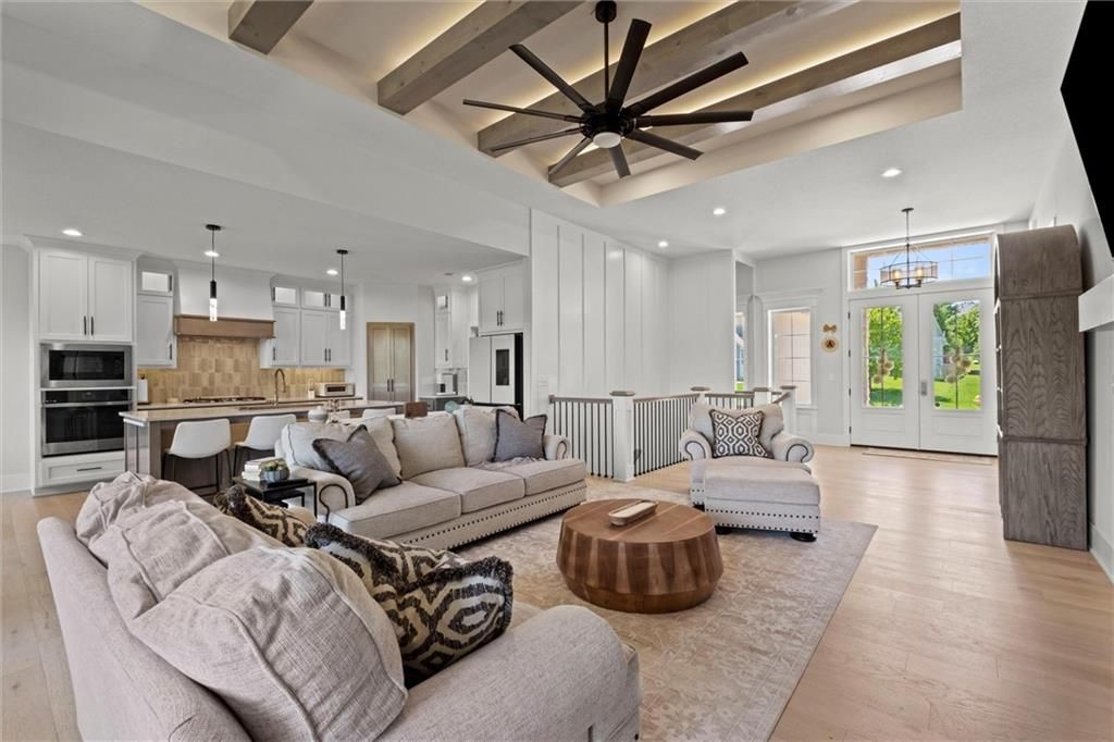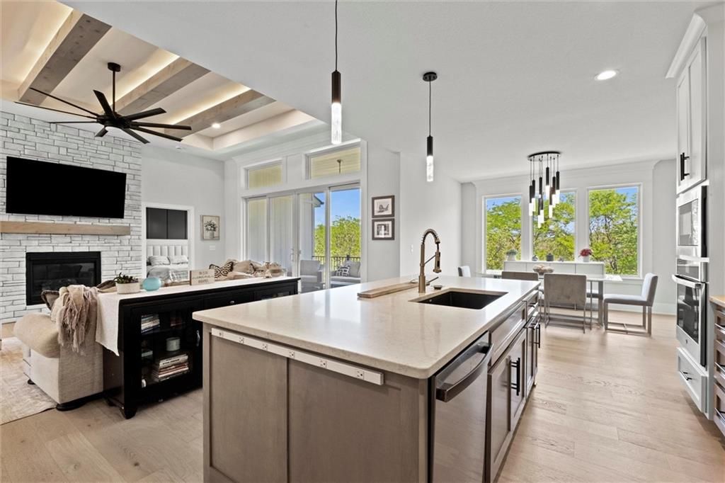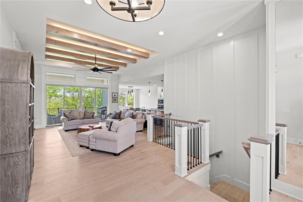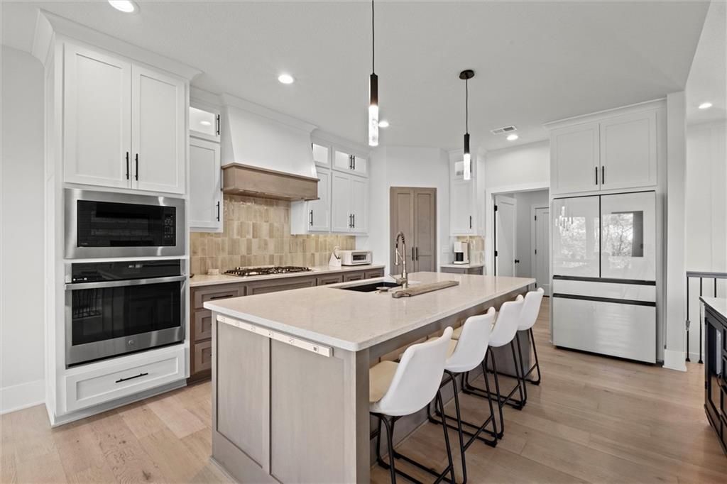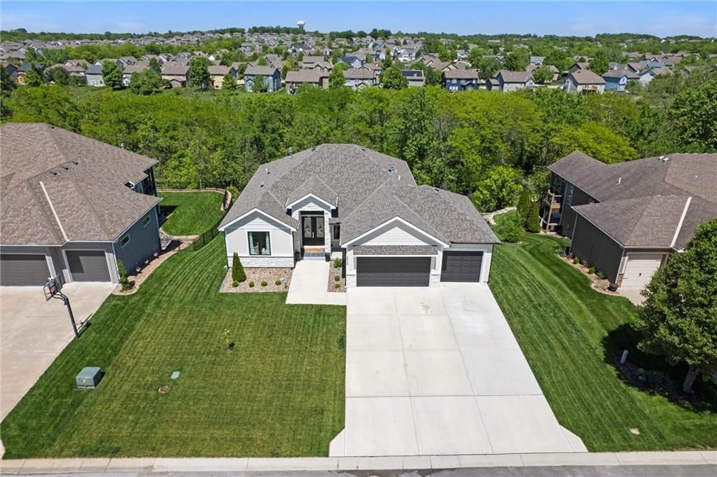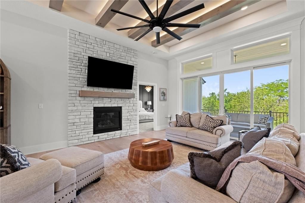 Motivated Sellers - Ready for a New Owner! This move-in-ready home has it all - privacy, beautiful finishes, and a peaceful setting backing to wooded greenspace, a creek, and a 23-acre nature park. Sellers are motivated and have priced this home to sell quickly! Inside, you'll love the spacious great room with 13' ceilings, exposed beams, soft lighting, a cozy fireplace, and a wall of windows with 8' sliders leading to a large covered deck. The kitchen is perfect for cooking and entertaining with a gas range, oversized island, upgraded lighting, and a roomy walk-in pantry, all opening to a dining area with backyard views. The primary suite offers a beamed ceiling, a spa-like bathroom with double vanities, a tiled shower with rainforest head, and a large L-shaped walk-in closet with built-ins. There's also a second main-floor bedroom with its own walk-in closet, plus a combined laundry and office space with a built-in desk right off the garage. The finished walkout lower level is an entertainer's dream, featuring a huge rec room with a wet bar and microwave, a full second kitchen, a half bath, and two more bedrooms - each with its own vanity - sharing a Jack-and-Jill bath. Luxury vinyl plank flooring runs throughout (no carpet). Enjoy the outdoors from the covered patio overlooking the creek - the property extends beyond the water for extra space and privacy. Neighborhood perks include 2 stocked ponds, 1.8 miles of walking trails, a playground, and 26 acres of preserved greenspace.