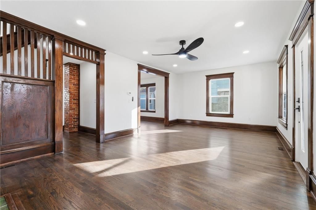 Welcome to this meticulously renovated 3-bedroom, 2.5-bathroom shirtwaist offering over 2,000 square feet across three sun-drenched stories in coveted Longfellow. This stunning home perfectly balances preserved architectural character with modern luxury. Step inside to discover beautifully restored wood trim, baseboards, and window casings creating warmth against fresh white walls and gleaming new hardwood floors throughout. The generous room sizes provide true flexibility for living, working, and entertaining. The showstopper kitchen features crisp off-white shaker cabinets, stunning backsplash, quartz countertops, and stainless appliances. The designer bathrooms rival luxury hotels with floating vanities, LED-lit mirrors, spa-worthy walk-in showers with contemporary tile, and sophisticated black matte fixtures. Pops of color through hexagon floor tiles add personality throughout. The expansive third-floor bonus space with vaulted ceilings offers endless possibilities as a primary suite, office, or media room. Every major system is brand new including dual-zone HVAC (first and second floors on one system, third floor independently controlled), energy-efficient windows, and a new roof. Located in one of KC's most walkable neighborhoods, you're steps from Longfellow's restaurants, coffee shops, and local businesses. Rare three-car parking includes a two-car garage plus covered carport accessed from the rear. The nice-sized yard and covered front porch complete this exceptional package. This isn't just another flip - it's a thoughtful restoration honoring classic bones while delivering every modern convenience. Move-in ready and waiting for you.