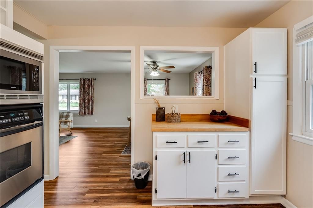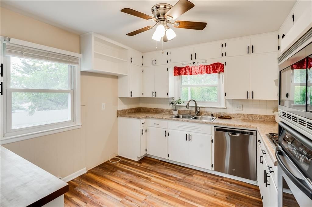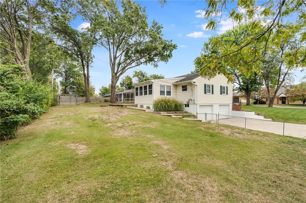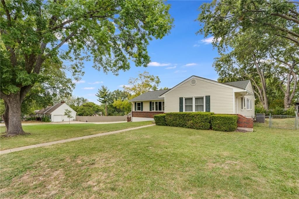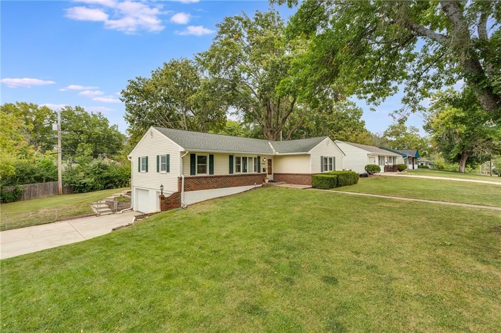 Beautifully maintained home on a corner lot with mature trees. The main level features updated LVP flooring in the living room and kitchen, fresh paint throughout, and a newly updated kitchen with stainless steel appliances. Enjoy multiple living areas, including a spacious dining/family room large enough for a piano and a full dining set. The finished basement has been thoughtfully converted into its own 1-bedroom, 1-bath apartment with a full kitchen - perfect for in-laws, grown kids, or even as an income-producing space. If you prefer, it can also serve as a flexible living area, ideal for guests, a recreation room, home gym, or private retreat. Additional highlights include high-efficiency windows, ceiling fans, and bright, energy-efficient lighting throughout, helping to keep utility costs lower. Practical features include a large garage with insulated doors, an expanded driveway, and a unique safe room/pantry. Centrally located with easy access to Kansas City amenities, this home truly stands out for its quality updates, flexible living spaces, and thoughtful improvements over the years.