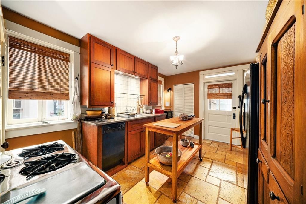 Authentic Craftsman architecture meets flexible, multi-generational living in this stately 3-story home in the coveted Nelson Akins Museum neighborhood. First time ever offered on MLS, this 6-bedroom, 4-bath residence showcases historic charm, modern comfort, and a rare third-floor 2 bedroom, bath and kitchen guest/au pair suite. Designed by prominent Kansas City architect Walter Root, the house was built for the family . The main level features a gracious living room with fireplace, formal dining, a bright sunroom, full bath, and an updated kitchen with excellent flow for entertaining. The second level offers four spacious bedrooms, a second sunroom, and another full bath. The third floor includes two more bedrooms, an auxiliary kitchen, and full bath - ideal for extended stays, studio use, or multi-generational living. Period details throughout: original woodwork, tall ceilings, and Craftsman design elements. Efficient radiant-floor gas heat, multi-zone electric cooling, and window units provide tailored climate control. Stone/rock basement offers storage/workspace. Outside, enjoy a 6,802 sq ft lot with mature landscaping, a composition roof, and a welcoming front porch and private back deck. A rare opportunity to own a historic home with space, flexibility, and architectural integrity - all in a prime Midtown location.