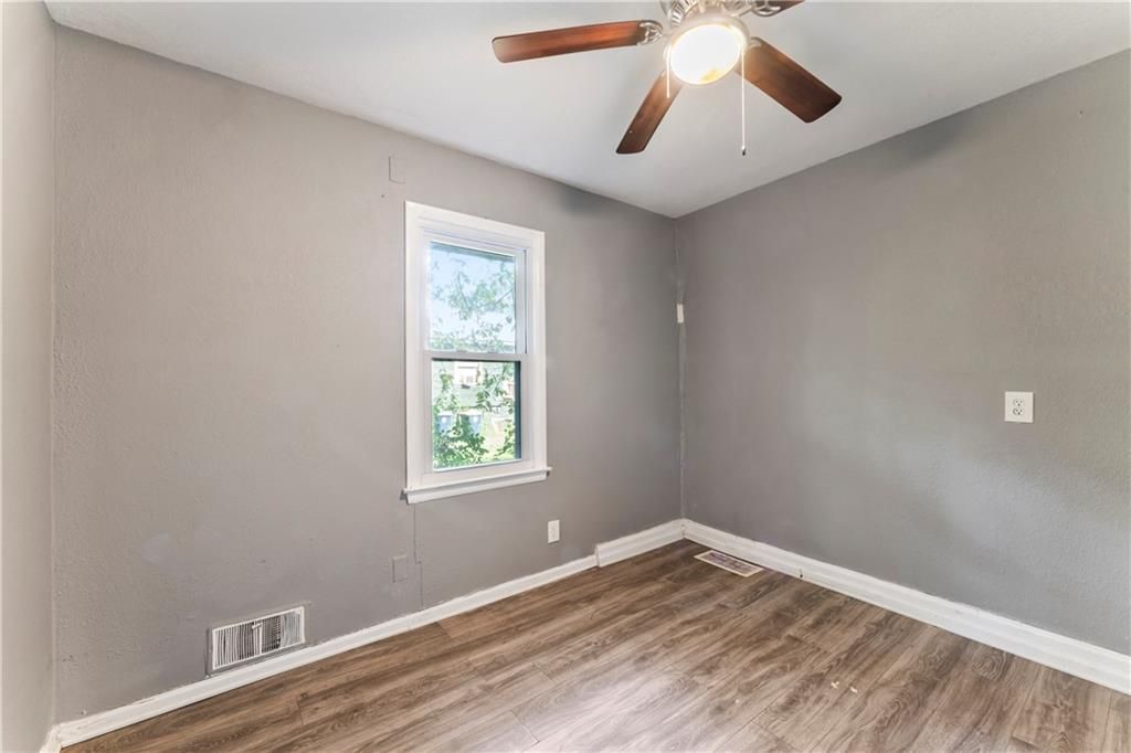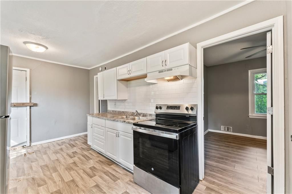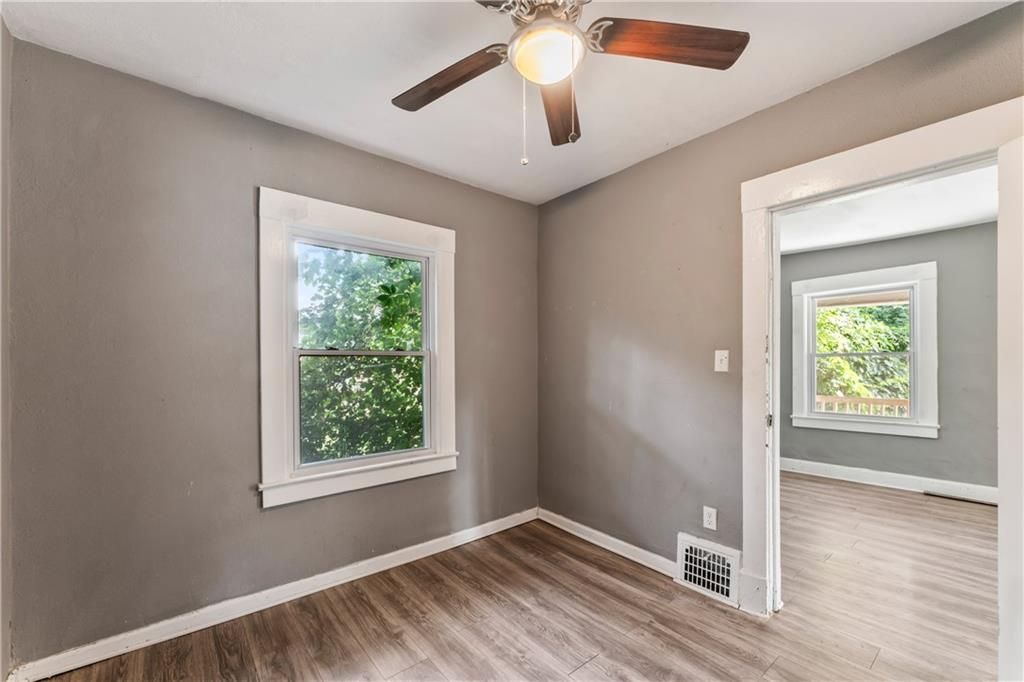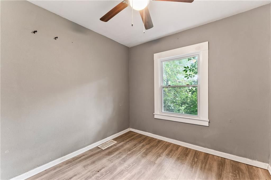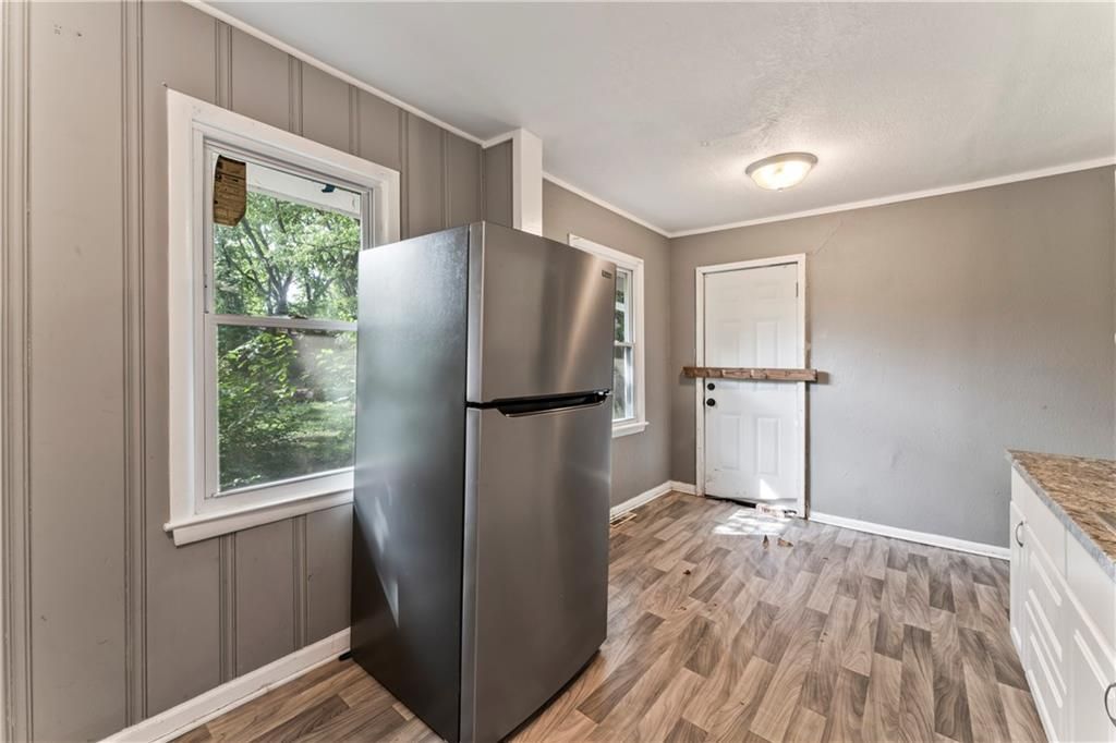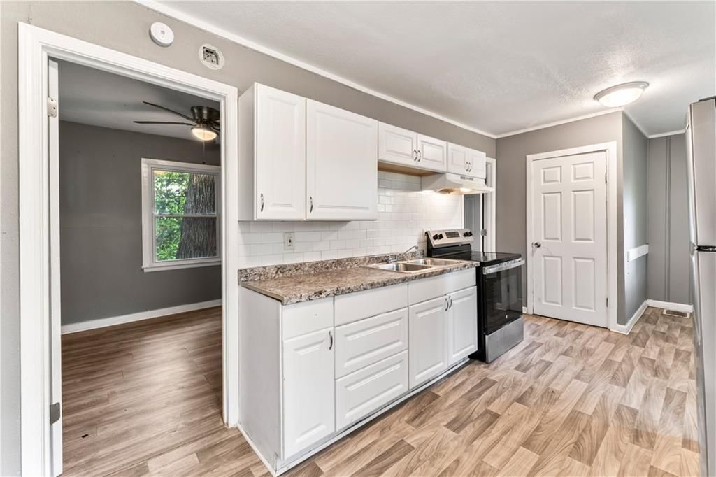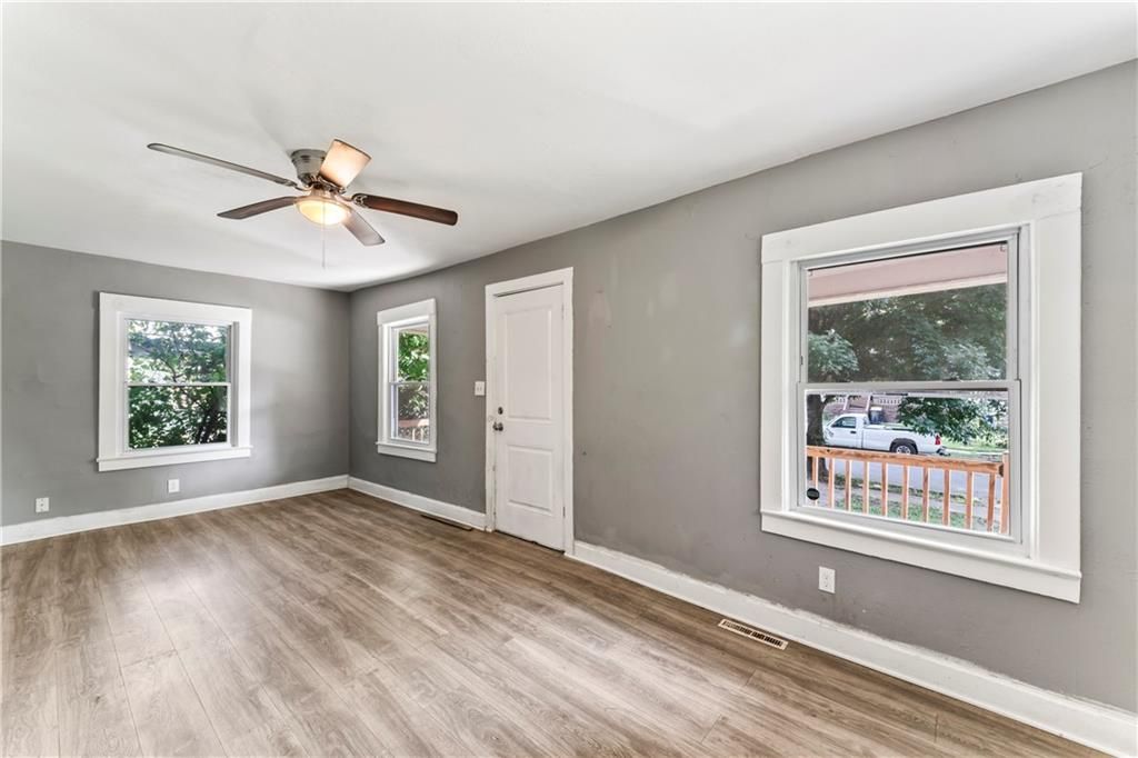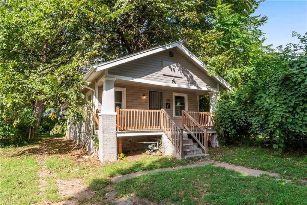 Calling all investors! This home has thoughtful updates, including updated flooring, stylish fixtures, and a completely remodeled kitchen and bath. Great front porch with new railing, white trim and neutral wall colors. Living room has LVP and a ceiling fan. The kitchen has a refrigerator and stove. Bedrooms have LVP and ceiling fans. Basement offer lots of storage. Door leads to treed backyard. Parking on left side of property.