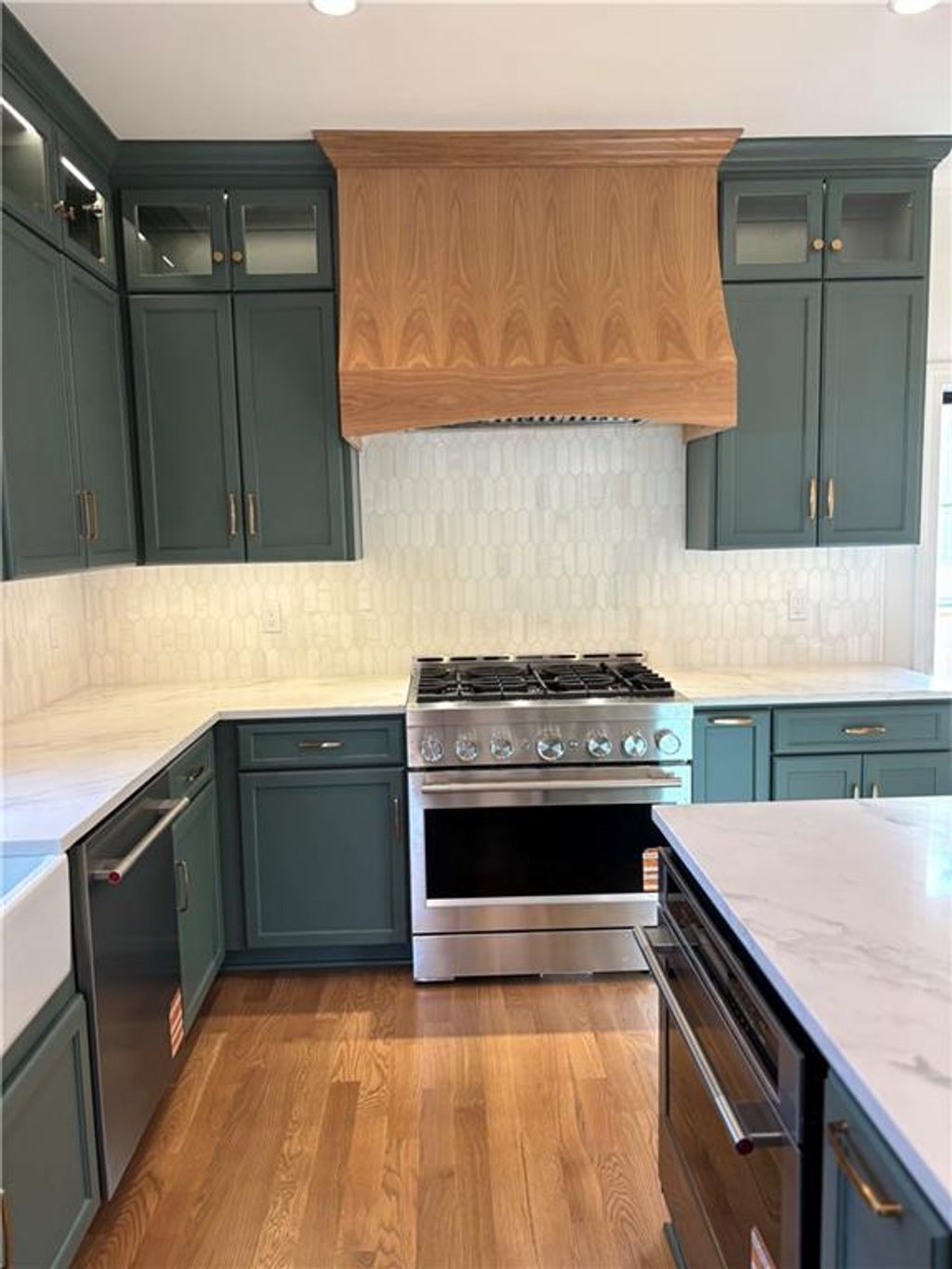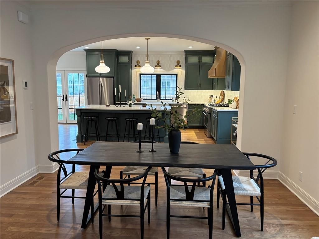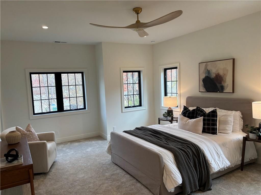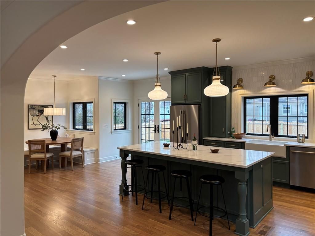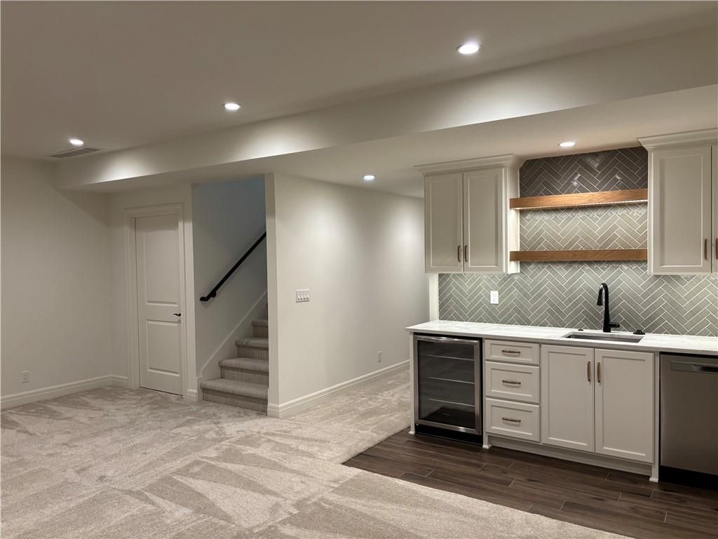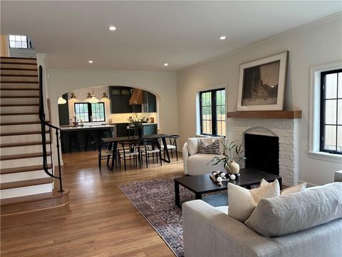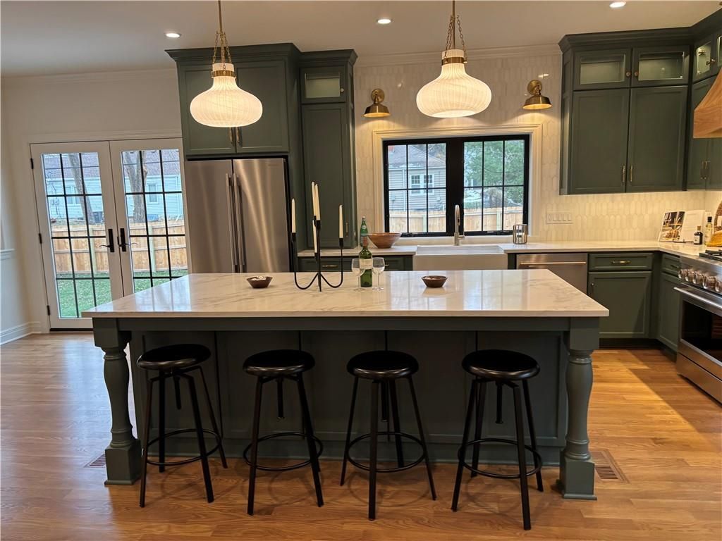Experience this magnificent French Country inspired two-story new build home in the heart of old Fairway. The main floor features a half bath, a mudroom/drop zone and laundry off the two-car garage. The open concept layout features beautiful archways, an informal dining area and a large social space featuring a beautiful brick fireplace. The chef's kitchen includes a walk-in pantry, custom cabinetry, high-end quartz countertops, a large island with extra storage, a custom-hooded range, and a built-in banquette seating area. All kitchen appliances are provided, a gas range, electric wall oven, microwave wall oven, dishwasher, full refrigerator, and a beverage refrigerator. French doors lead out to a patio and an expansive backyard space. The second floor includes a large primary suite with two walk-in closets and an en-suite bath oasis featuring a soaking tub, a large shower, and a beautiful custom double vanity. The upper floor also has three additional bedrooms, two full bathrooms and a full-sized laundry room. The basement includes the 5th bedroom, a full bathroom and an additional family room area with a kitchenette that includes a dishwasher and beverage refrigerator. Other custom features include solid core interior doors, solid hardwood floors throughout with carpet in the bedrooms and lower level, hinged frameless glass shower doors, high-end lighting and trim packages, zoned HVAC, and EV capability. 9-foot ceilings on all three levels. All the custom cabinetry includes soft-close doors and drawers. The backyard includes a new 6-foot privacy fence, a fully automated irrigation system with thoughtful landscaping. This home is move-in ready!