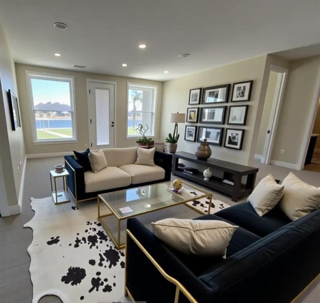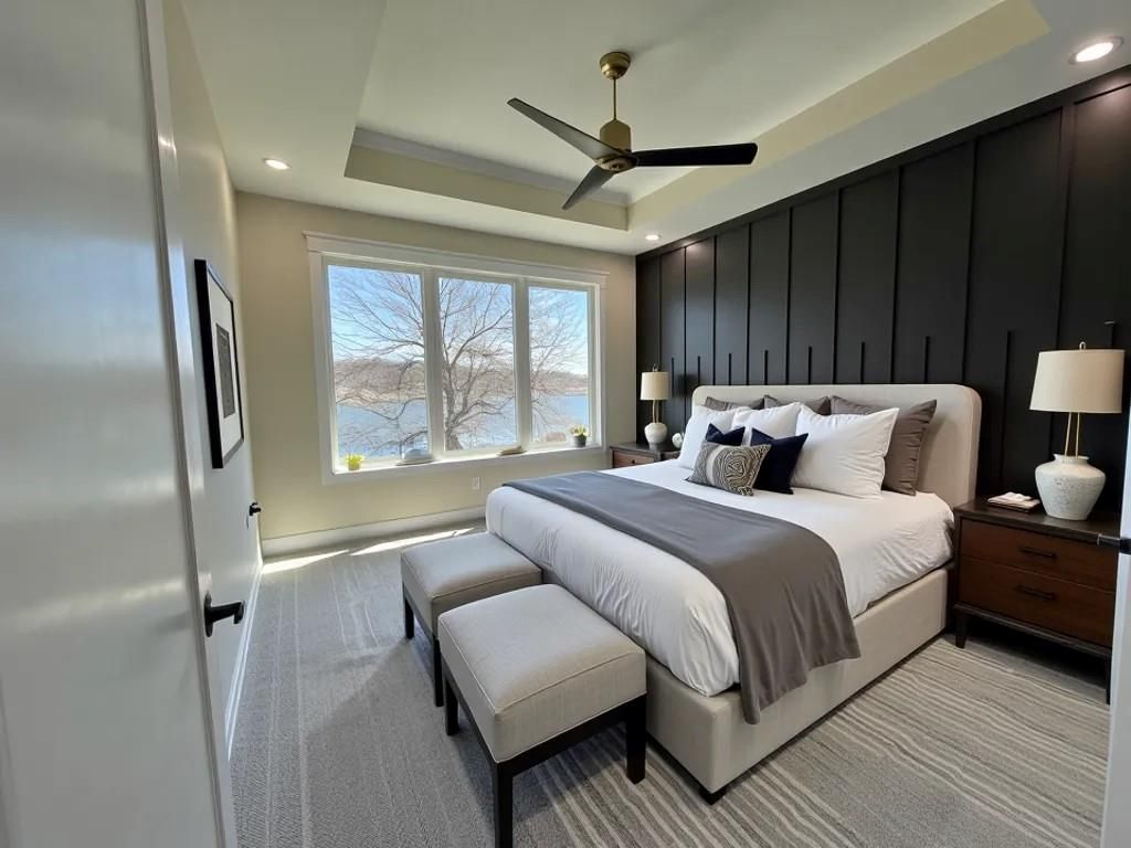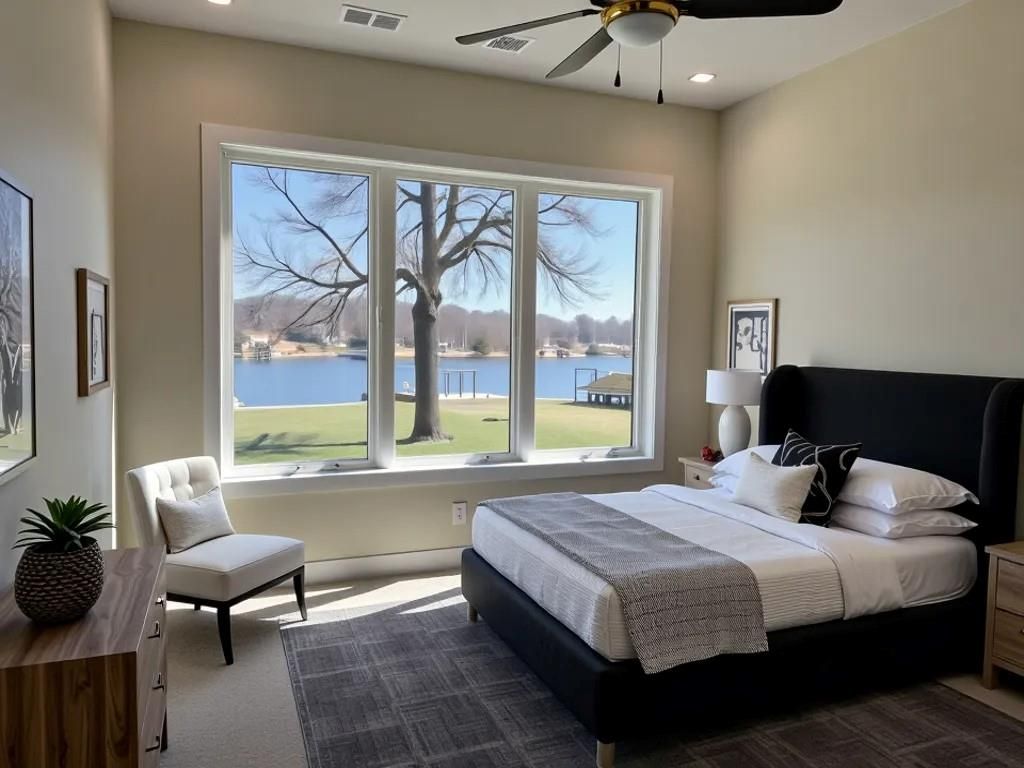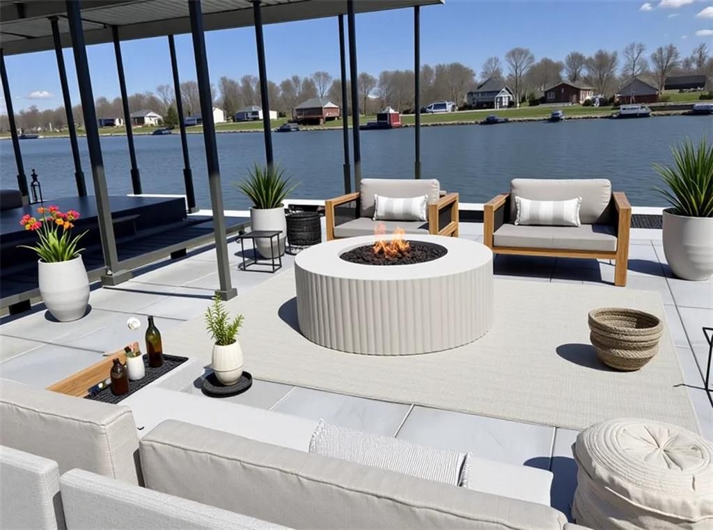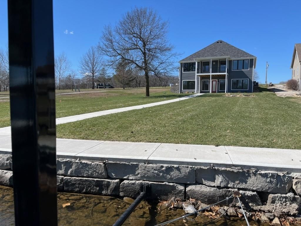 Brand New Lakefront Home on Lake Viking - Just in Time for Lake Season! New construction home is perfectly positioned on Lake Viking, offering lake views from nearly every room. Picture windows in the living room, kitchen, family room, & ALL bedrooms flood the home with natural light & showcase the lake's beauty from every angle. Built with luxury & functionality in mind, the home features quartz countertops throughout, upgraded lighting fixtures, & fully tiled showers in every bathroom. The kitchen is perfectly oriented to capture lake views, featuring a quartz waterfall island & opens onto a covered deck with composite flooring & ceiling - ideal for grilling, relaxing or entertaining. The master suite is serene with more lake views & a spa-like ensuite bath featuring dual vanities, plus a dedicated makeup vanity, soaker tub, separate tiled shower & spacious walk-in closet. A large main-level office with vaulted ceilings, hardwood floors, & designer lighting provides a great work-from-home space or versatile flex room. Custom iron railings & a lit stairway lead to the walkout lower level, featuring 2 generously sized lakeview bedrooms, 2 additional full baths with zero-entry tiled showers, a game room with wet bar & a spacious family room that opens to a lakefront patio. Step outside to the new sidewalk that leads to your private dock, equipped with 2 wave runner lifts & a boat lift.(Two 11x28 slips). A sprinkler system services both the front & back yards, drawing water directly from the lake. A standout feature is the 4th garage, accessible from the back of the home & wrapping around to the front - providing ample storage for lake toys, lawn equipment, or workshop space. The exterior is as thoughtfully designed as the interior, with Hardie board siding, keystone retaining walls perfect for flower beds, & mini can lighting that create striking curb appeal at night. Move-in ready - just bring your boat & start enjoying the Lake Viking lifestyle!